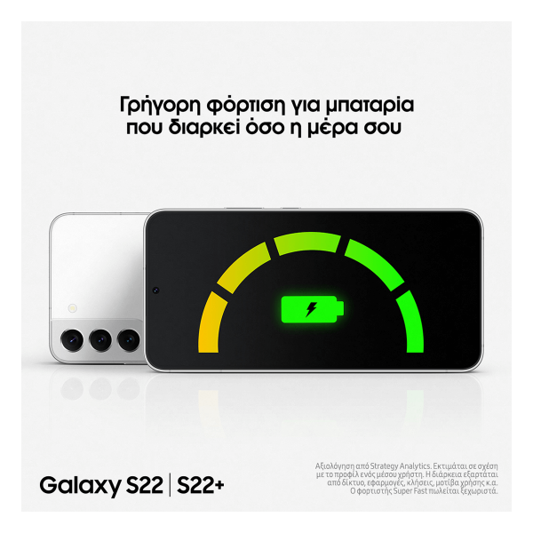 Η σειρά SAMSUNG Galaxy S22 υποστηρίζει δίκτυο 5G αλλά και τεχνολογία Wi-Fi 6E για ν’ απολαμβάνεις απρόσκοπτο streaming 4K βίντεο και gaming, γρήγορο downloading αρχείων και πλοήγηση στο διαδίκτυο και απρόσκοπτες βιντεοκλήσεις. Το highlight είναι ο πανίσχυρος επεξεργαστής Exynos 2200 (4nm AP), o ταχύτερος σε συσκευή Galaxy ο οποίος εκτοξεύει τις επιδόσεις του! Έτσι, σε συνδυασμό με τη μνήμη RAM (8/ 12GB στο S22 Ultra, 8GB στα S22+ και S22) θα βιώσεις αποτελεσματικότητα στη διαχείριση εντολών και εργασιών όπως ποτέ άλλοτε. Επιπλέον, διαθέτει εσωτερική μνήμη μεγάλης χωρητικότητας (128/ 256/ 512GB σε S22 Ultra, 128/ 256GB σε S22+ και S22) για άνετη αποθήκευση δεδομένων, εφαρμογών και αρχείων δίχως το άγχος των συχνών διαγραφών. Όσο για την αυτονομία της μπαταρίας του (5000mAh στο S22 Ultra, 4500mAh στο S22+, 3700mAh στο S22) διαρκεί καθ' όλη τη διάρκεια της ημέρας και υποστηρίζει υπερταχεία φόρτιση (45W 2.0 σε S22 Ultra και S22+), ώστε να είναι συνεχώς γεμάτο ενέργεια όπως κι εσύ!