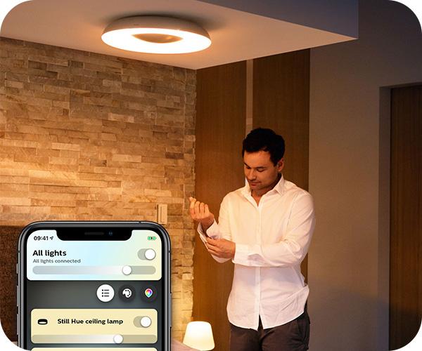 Σύνδεσε το PHILIPS Hue White Ambiance έξυπνο φωτιστικό οροφής Still με το Philips Hue Bridge και ανακάλυψε τις ατελείωτες δυνατότητες που μπορεί να σου προσφέρει. Αρχικά, μπορείς να ελέγξεις τα φώτα σου από το Smartphone ή το Tablet σου με την εφαρμογή Philips Hue σε iOS και Android συσκευές. Έτσι μπορείς να ελέγχεις τα φώτα του σπιτιού από απόσταση, όπου και αν βρίσκεσαι για να μην έχεις κανένα άγχος.