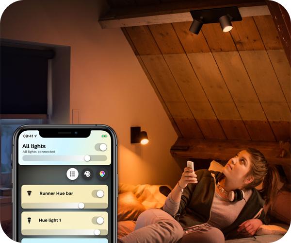 Με την εφαρμογή Hue Bluetooth, ο έλεγχος είναι στα χέρια σου. Μπορείς να προσθέσεις έως και 10 έξυπνα φώτα και να τα ελέγξεις όλα μαζί με ένα απλό άγγιγμα στην κινητή σου συσκευή. Επιπλέον, με αυτήν την εφαρμογή, μπορείς να προσαρμόσεις το χρώμα, τη φωτεινότητα και την ατμόσφαιρα του φωτισμού σου με άνεση. Απλώς άνοιξε την εφαρμογή, επέλεξε τα φώτα που θέλεις να ελέγξεις και προσάρμοσε τις ρυθμίσεις σου με ένα μόνο άγγιγμα.