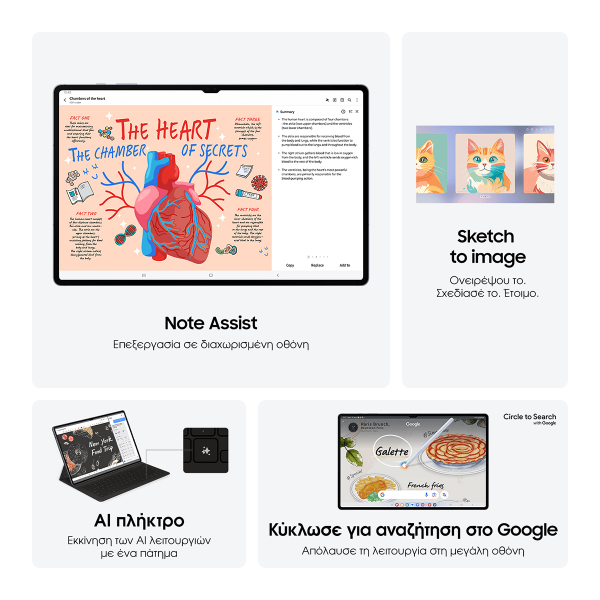 Με το SAMSUNG Galaxy Tab S10 Ultra και το Galaxy AI θα ενισχύσεις την εμπειρία και την παραγωγικότητά σου. Εγγραφή φωνής για μετατροπή ηχογραφήσεων σε κείμενο, Κύκλωσε για αναζήτηση στο Google, Samsung Internet για γρήγορες περιλήψεις και Σημειώσεις για αυτόματη μορφοποίηση, με τη βοήθεια της τεχνητής νοημοσύνης έχεις όλα τα «εργαλεία» στη διάθεσή σου. Μάλιστα, μέσω και του S Pen (συμπεριλαμβάνεται) θα βιώσεις προηγμένη λειτουργικότητα σε σκίτσα και σχέδια με τα Σκίτσο σε εικόνα και Έξυπνη επιλογή, με το Air Command να σου δίνει άμεση πρόσβαση στις λειτουργίες AI. Τέλος, το Κύκλωσε για αναζήτηση με το S Pen θα σου λύσει τα χέρια!