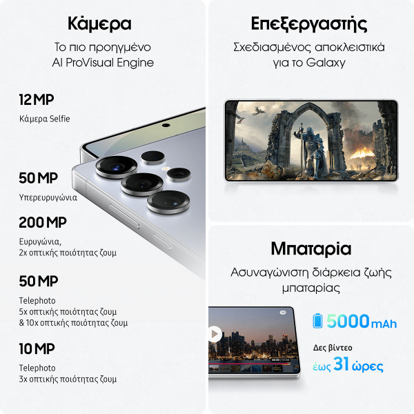 Το νέο SAMSUNG Galaxy S25 Ultra είναι το AI Smartphone που θα είναι δίπλα σου σε κάθε σου βήμα. Με το Galaxy S25 Ultra έχεις μαζί σου πάντα έναν ΑΙ βοηθό που κάνει την καθημερινότητά σου, πιο εύκολη από ποτέ! Τώρα, μπορείς απλά με φωνητικές εντολές χρησιμοποιώντας φυσική γλώσσα να ολοκληρώνεις καθημερινές εργασίες εύκολα. Και δεν σταματάει εκει! Η κάμερα ProVisual Engine επόμενης γενιάς, ο πανίσχυρος επεξεργαστής Qualcomm Snapdragon 8 Elite Gen 3 και η μπαταρία μακράς διαρκείας χωρητικότητας 5.000 mAh με ταχεία φόρτιση σε κάνουν να απολαμβάνεις κάθε στιγμή με το Galaxy S25 Ultra.