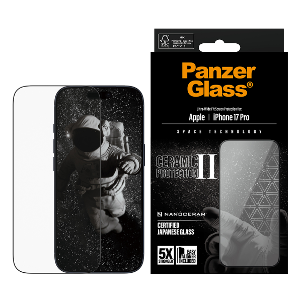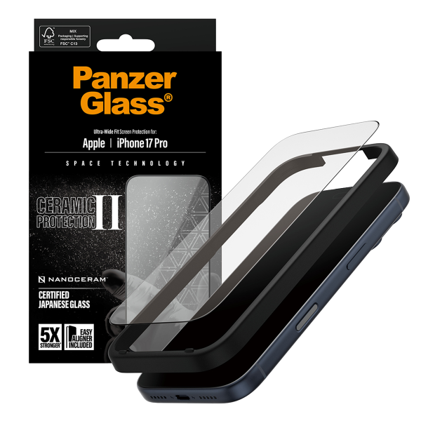 Το νέο γυαλί προστασίας οθόνης με πλαίσιο PANZERGLASS Ultra - Wide Fit Ceramic Protection II για iPhone 17 Pro θέτει ένα νέο πρότυπο αντοχής. Είναι 5 φορές ισχυρότερο από οποιοδήποτε άλλο προστατευτικό μας μέχρι σήμερα και μπορεί να αντέξει ακόμα και μια χαλύβδινη σφαίρα 320 γραμμαρίων που πέφτει από 2,5 μέτρα, χωρίς να σπάσει. Κάθε χρήση του τηλεφώνου σου γίνεται πλέον χωρίς φόβο για την οθόνη.