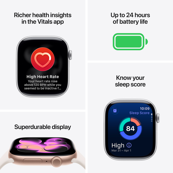 Το Apple Watch Series 11 σου προσφέρει πολύτιμες πληροφορίες για την υγεία σου, όπως ειδοποιήσεις για υπέρταση και βαθμολογία ύπνου. Βελτίωσε τη φυσική σου κατάσταση με προηγμένες μετρήσεις. Απόλαυσε διάρκεια λειτουργίας μπαταρίας έως 24 ώρες.