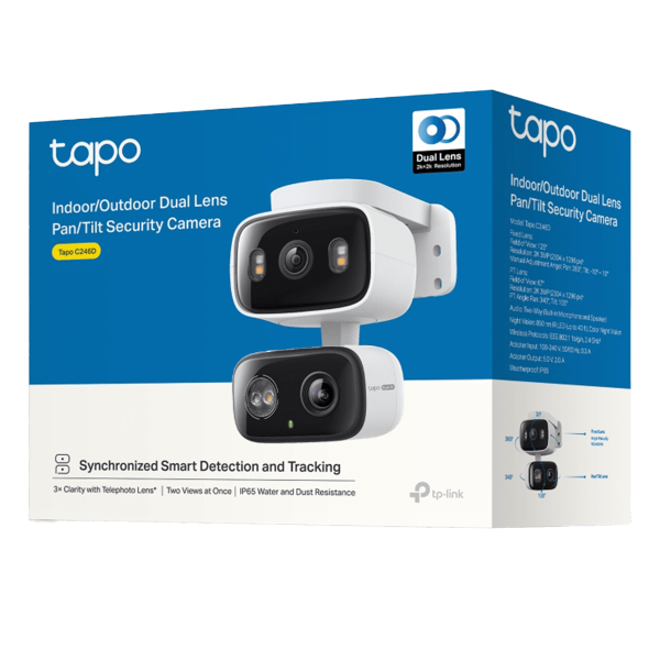 Η TP-LINK Tapo C246D Dual Lens Pan/ Tilt εσωτερική/ εξωτερική κάμερα είναι μια πανίσχυρη κάμερα ασφαλείας διπλού φακού που σου προσφέρει πλήρη εποπτεία χωρίς τυφλά σημεία. Με ανάλυση 2K (3MP), ευρυγώνιο φακό 125° και τηλεφακό 6 mm με 10,8× ψηφιακό ζουμ, αποτυπώνει καθαρή εικόνα και την παραμικρή λεπτομέρεια. Η έξυπνη τεχνολογία Synchronized Smart Tracking ακολουθεί αυτόματα την κίνηση, ενώ με το One-Tap Smart Focus εστιάζεις άμεσα όπου θέλεις. Είναι ανθεκτική στις καιρικές συνθήκες (IP65), ιδανική για εσωτερικούς και εξωτερικούς χώρους, και διαθέτει νυχτερινή όραση σε χρώμα ή υπέρυθρη λειτουργία για καθαρή εικόνα κάθε στιγμή. Χάρη στην AI ανίχνευση αναγνωρίζει άνθρωπο, όχημα, ζώο ή γενική κίνηση, στέλνοντάς σου ειδοποιήσεις χωρίς συνδρομή. Υποστηρίζει τοπική αποθήκευση σε κάρτα microSD έως 512 GB ή cloud, ενώ συνδέεται εύκολα με Wi-Fi 2.4 GHz και συνεργάζεται με Amazon Alexa, Google Assistant και SmartThings.